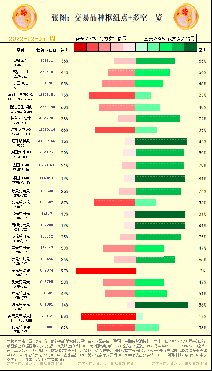汇通财经APP讯——一张图:交易品种枢纽点+多空占比一览。截止今日(2022/12/05周一)目前最新多空数据显示,头寸达到80%及以上的品种有:★ 道琼斯指数 US30空头占比高达84%。德国DAX...