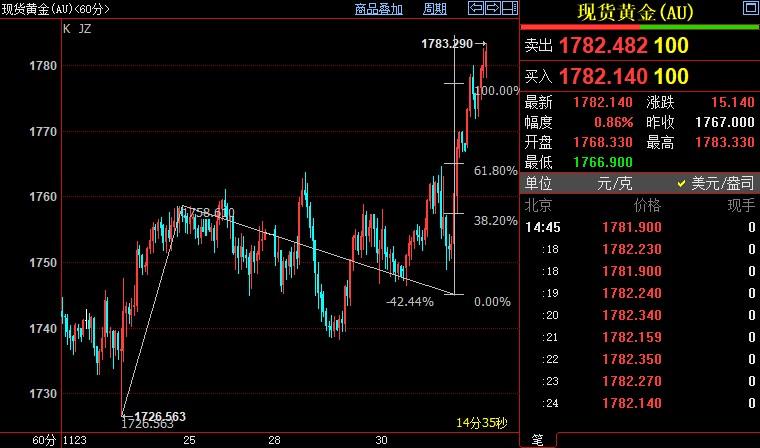汇通财经APP讯——周四(12月1日),国际金价连续第三个交易日走强,创11月16日以来新高至1783.02美元/盎司,因美联储主席鲍威尔的讲话强化市场对美联储加息幅度放慢预期。金价后市上看1790美...