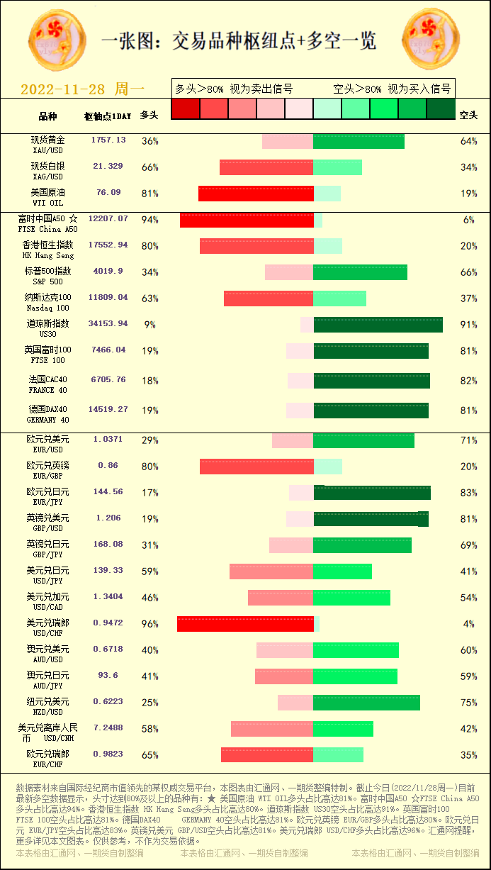 一张图:交易品种枢纽点+多空占比一览。截止今日(2022/11/28周一)目前最新多空数据显示,头寸达到80%及以上的品种有:★ 美国原油 WTI OIL多头占比高达81%。富时中国A50 ☆FTSE...
