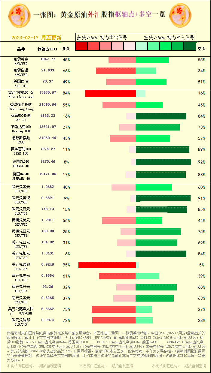 汇通财经APP讯——一张图:黄金原油外汇股指"枢纽点+多空占比"一览。今日(2023/02/17周五)最新出炉的数据显示,截止上个交易日结束时,头寸达到80%及以上的品种有:★ 富时中国A50 ☆FT...