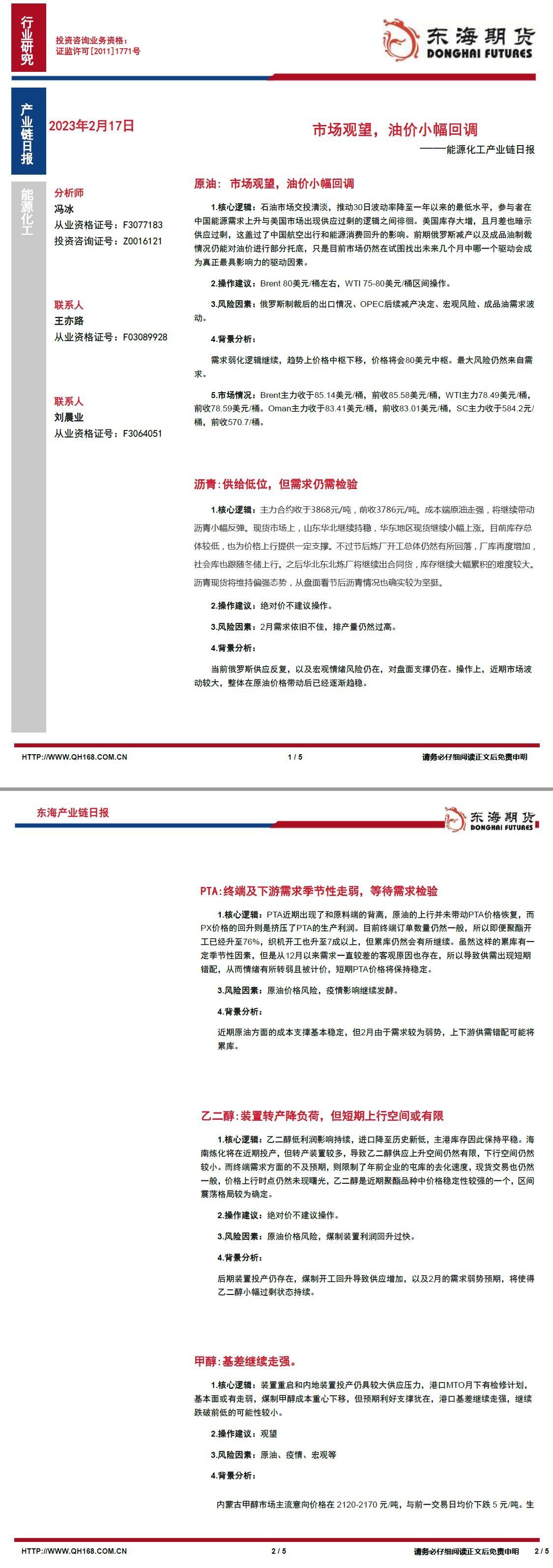 汇通财经APP讯——原油:市场观望,油价小幅回调沥青:供给低位,但需求仍需检验PTA:终端及下游需求季节性走弱,等待需求检验乙二醇:装置转产降负荷,但短期上行空间或有限甲醇:基差继续走强L:价格企稳,...