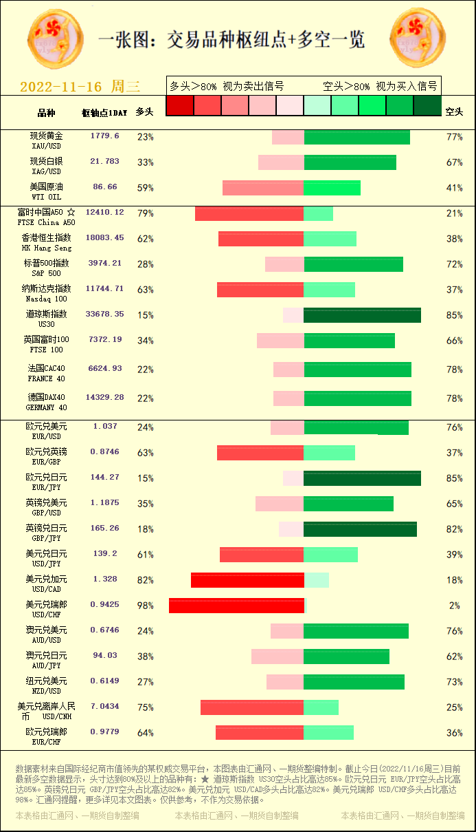 一张图:交易品种枢纽点+多空占比一览。截止今日(2022/11/16周三)目前最新多空数据显示,头寸达到80%及以上的品种有:★ 道琼斯指数 US30空头占比高达85%。欧元兑日元 EUR/JPY空头...
