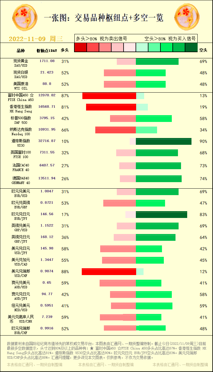 一张图:交易品种枢纽点+多空占比一览。截止今日(2022/11/09周三)目前最新多空数据显示,头寸达到80%及以上的品种有:★ 富时中国A50 ☆FTSE China A50多头占比高达87%。香港...