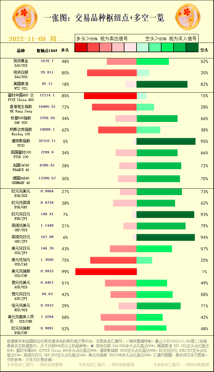 一张图:交易品种枢纽点+多空占比一览。截止今日(2022/11/08周二)目前最新多空数据显示,头寸达到80%及以上的品种有:★ 现货白银 XAG/USD多头占比高达80%。美国原油 WTI OIL空...