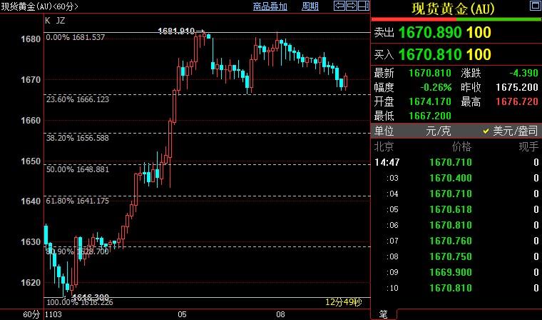 受美元走软提振,金价周一持稳在上周五触及的三周高位附近,但由于上周五金价急升后的抛压较大,使得周一金价表现稍欠人意,小幅收低。当天,黄金开盘1681.04,收盘1674.68。上周五的数据显示,美国雇...