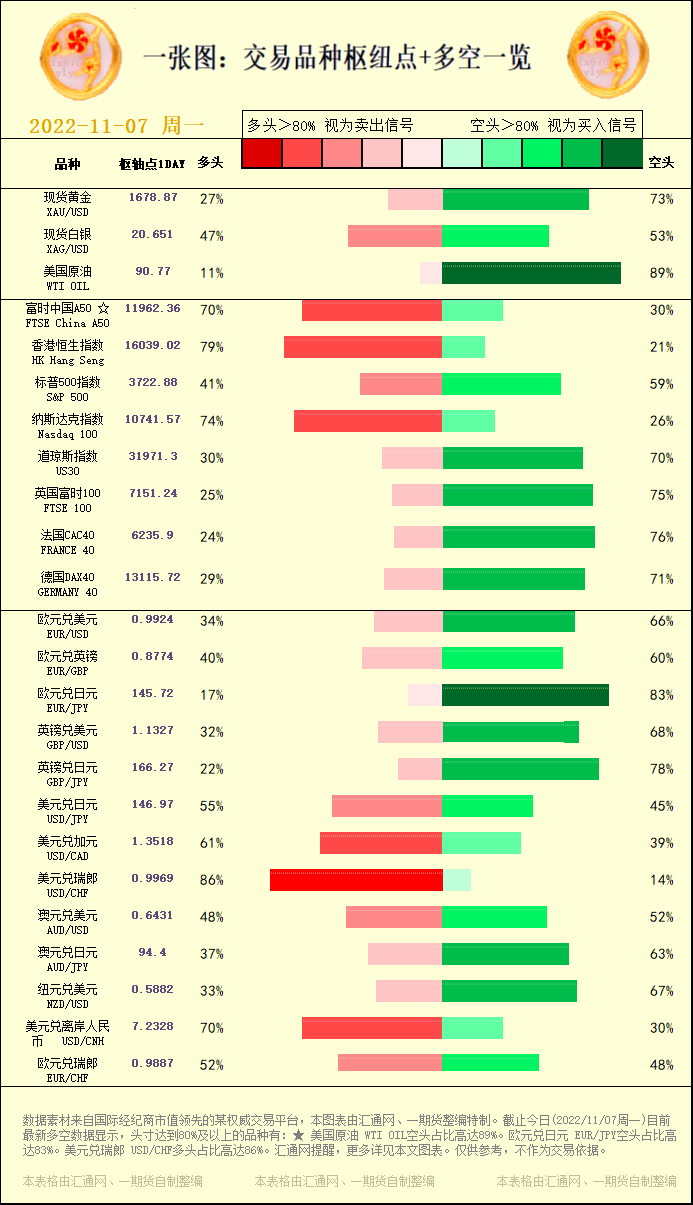 一张图:交易品种枢纽点+多空占比一览。截止今日(2022/11/07周一)目前最新多空数据显示,头寸达到80%及以上的品种有:★ 美国原油 WTI OIL空头占比高达89%。欧元兑日元 EUR/JPY...