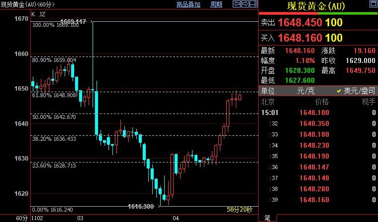 周五(1月4日)亚洲时段,现货黄金震荡反弹,一度涨逾1%创两个交易日高点至1648.48美元/盎司,因市场预计美国10月份非农新增就业人数料创近两年新低,而且失业率会小幅上升至3.6%,美元指数震荡回...