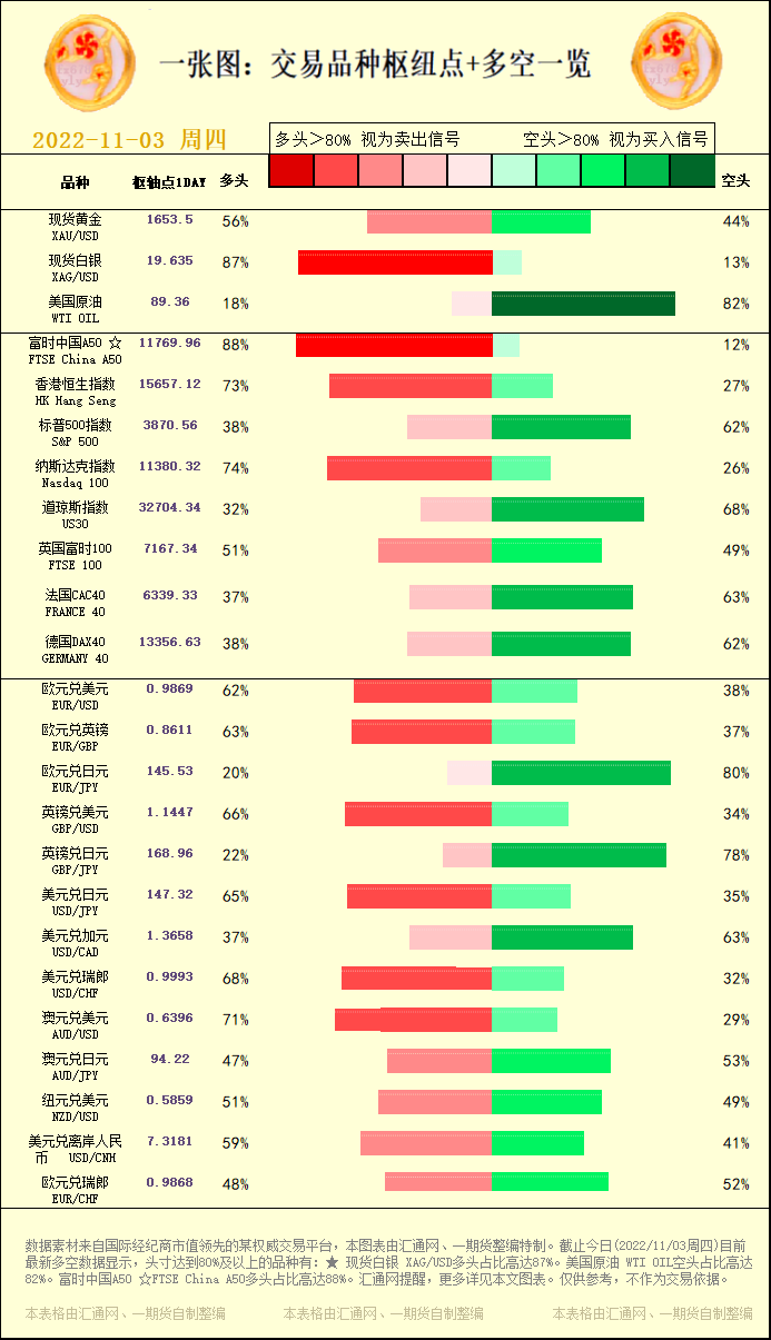一张图:交易品种枢纽点+多空占比一览。截止今日(2022/11/03周四)目前最新多空数据显示,头寸达到80%及以上的品种有:★ 现货白银 XAG/USD多头占比高达87%。美国原油 WTI OIL空...