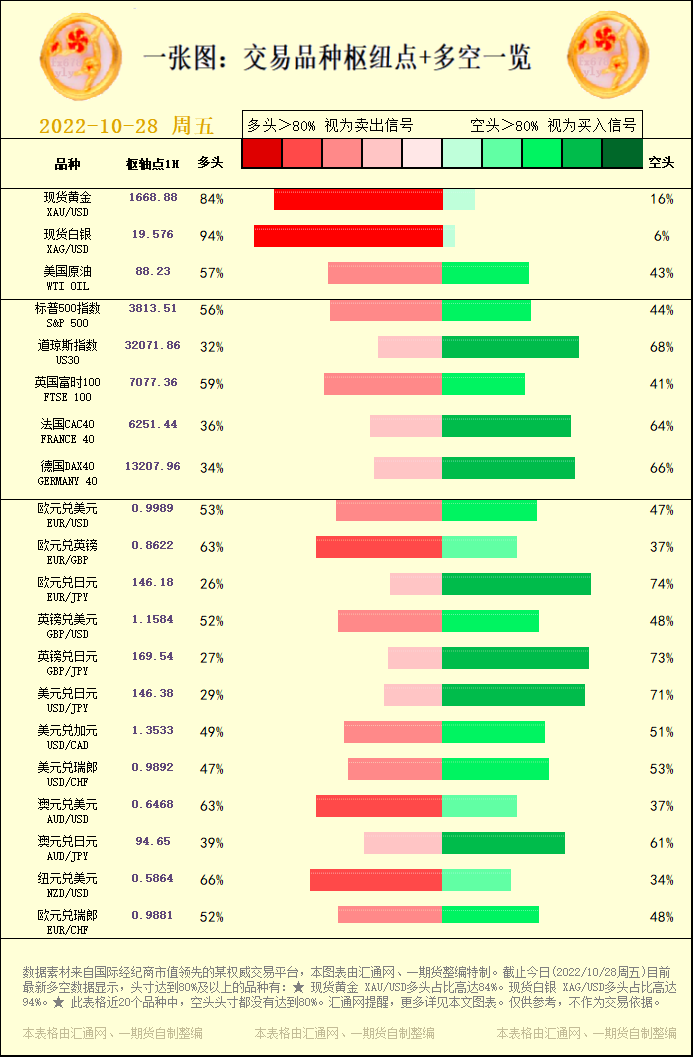 一张图:交易品种枢纽点+多空占比一览(2022/10/28周五)。截止今日(2022/10/28周五)目前最新多空数据显示,头寸达到80%及以上的品种有:★ 现货黄金 XAU/USD多头占比高达84%...