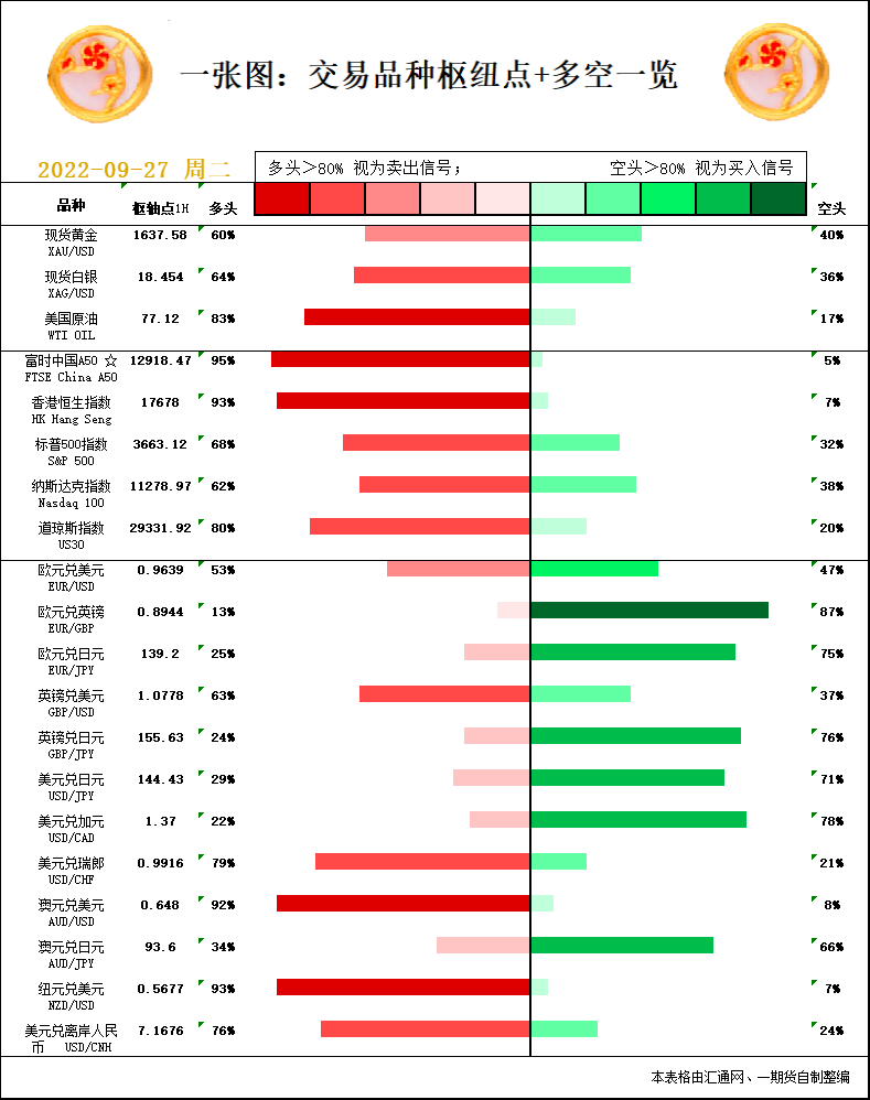 一张图:9月27日黄金白银、原油、股指、外汇“枢纽点+多空信号”;周二(9月27日)一张图看“枢纽点+多空信号”,品种包括:黄金、白银、原油、股指、欧元、英镑、日元、澳元、纽元、加元、富时中国A50、...