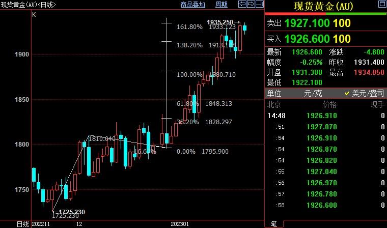 汇通财经APP讯——周五(1月20日)亚洲时段,现货黄金震荡微跌,目前交投于1928.63美元/盎司附近,美元走软和美国加息放缓的希望提高避险黄金的吸引力,隔夜金价大涨近30美元,周线有望录得五连阳,...