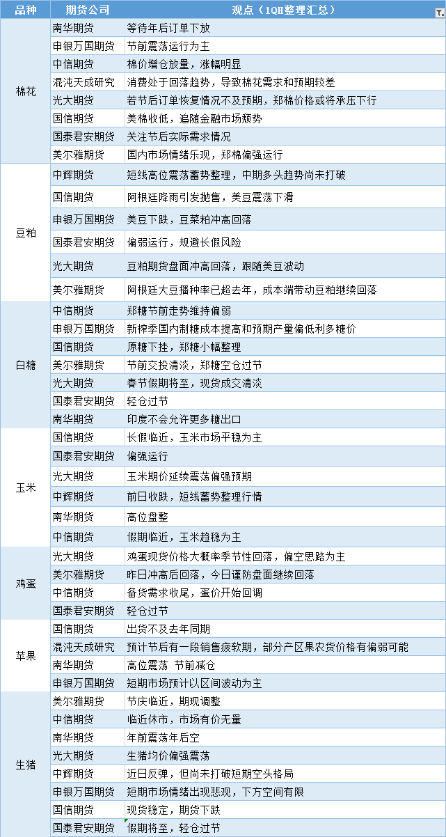 汇通财经APP讯——期货公司观点汇总一张图:1月20日农产品(棉花、豆粕、白糖、玉米、鸡蛋、生猪等)
