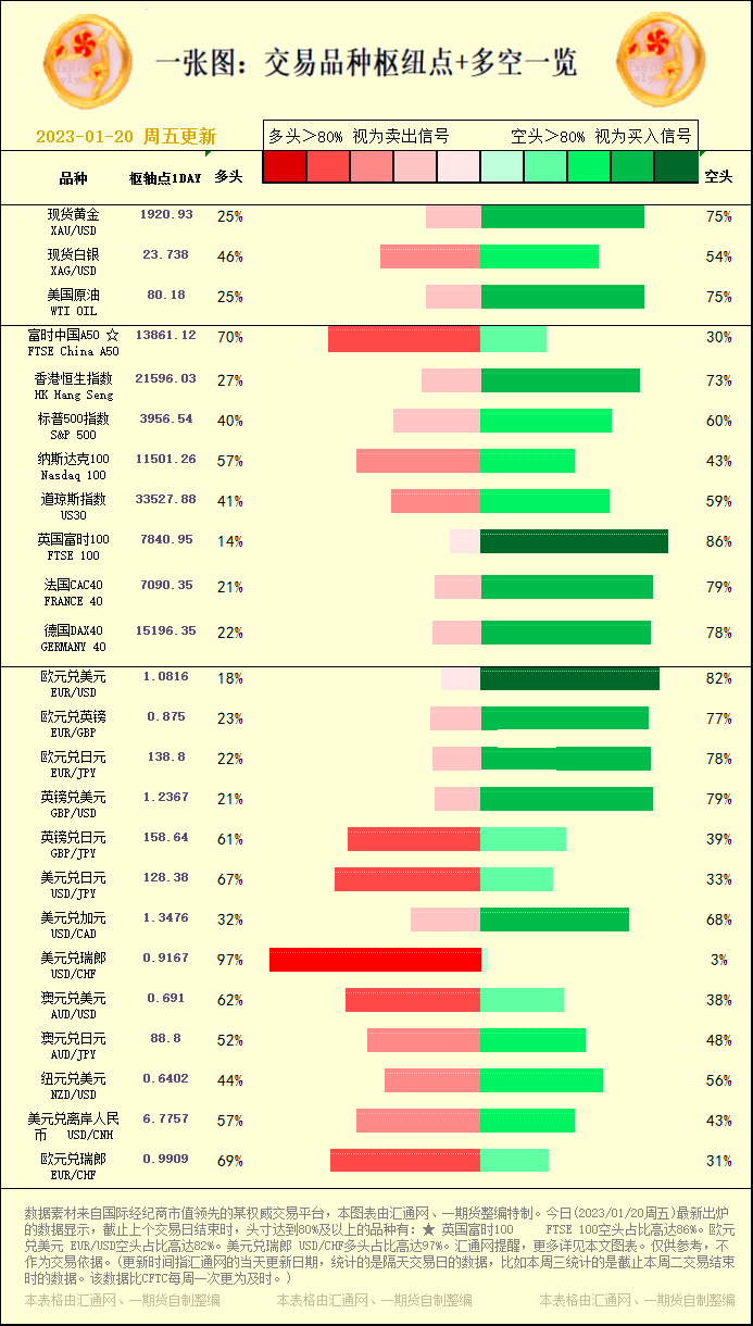 汇通财经APP讯——一张图:交易品种枢纽点+多空占比一览。今日(2023/01/20周五)最新出炉的数据显示,截止上个交易日结束时,头寸达到80%及以上的品种有:★ 英国富时100 FTSE 100空...