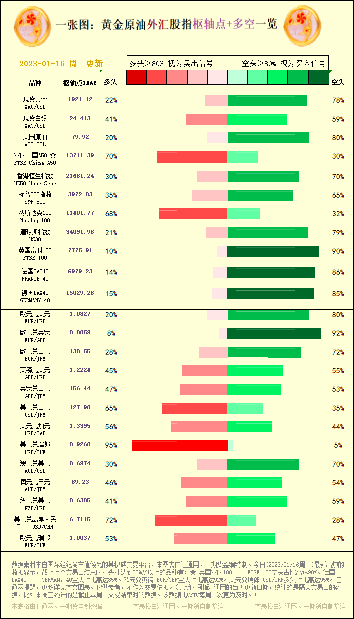 汇通财经APP讯——一张图:黄金原油外汇股指"枢纽点+多空占比"一览。今日(2023/01/16周一)最新出炉的数据显示,截止上个交易日结束时,头寸达到80%及以上的品种有:★ 英国富时100 FTS...