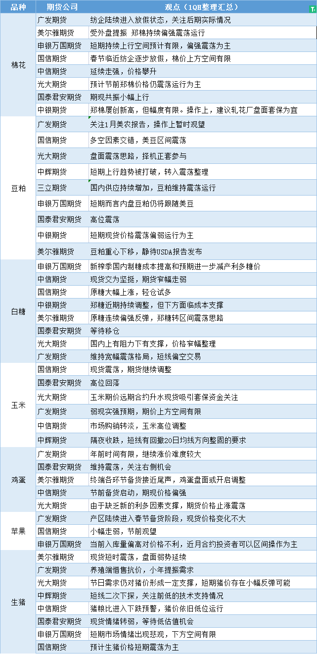 汇通财经APP讯——期货公司观点汇总一张图:1月11日农产品(棉花、豆粕、白糖、玉米、鸡蛋、生猪等)