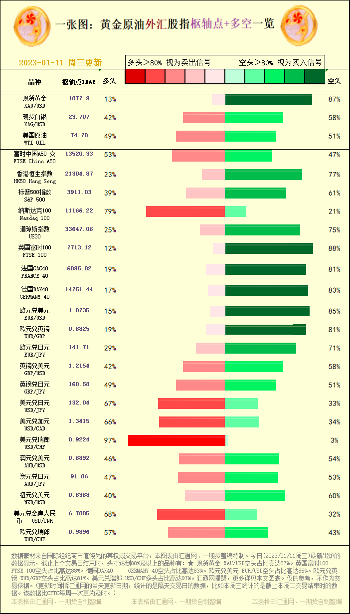 汇通财经APP讯——一张图:黄金原油外汇股指"枢纽点+多空占比"一览。今日(2023/01/11周三)最新出炉的数据显示,截止上个交易日结束时,头寸达到80%及以上的品种有:★ 现货黄金 XAU/US...