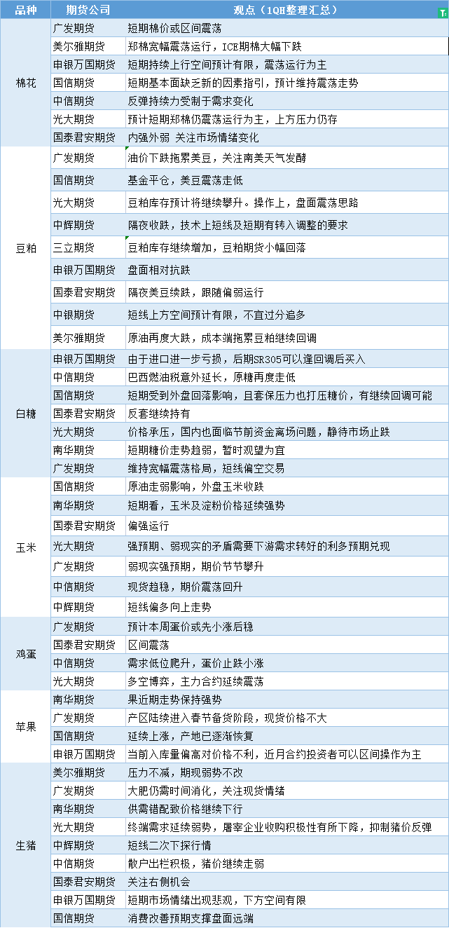 汇通财经APP讯——期货公司观点汇总一张图:1月5日农产品(棉花、豆粕、白糖、玉米、鸡蛋、生猪等)