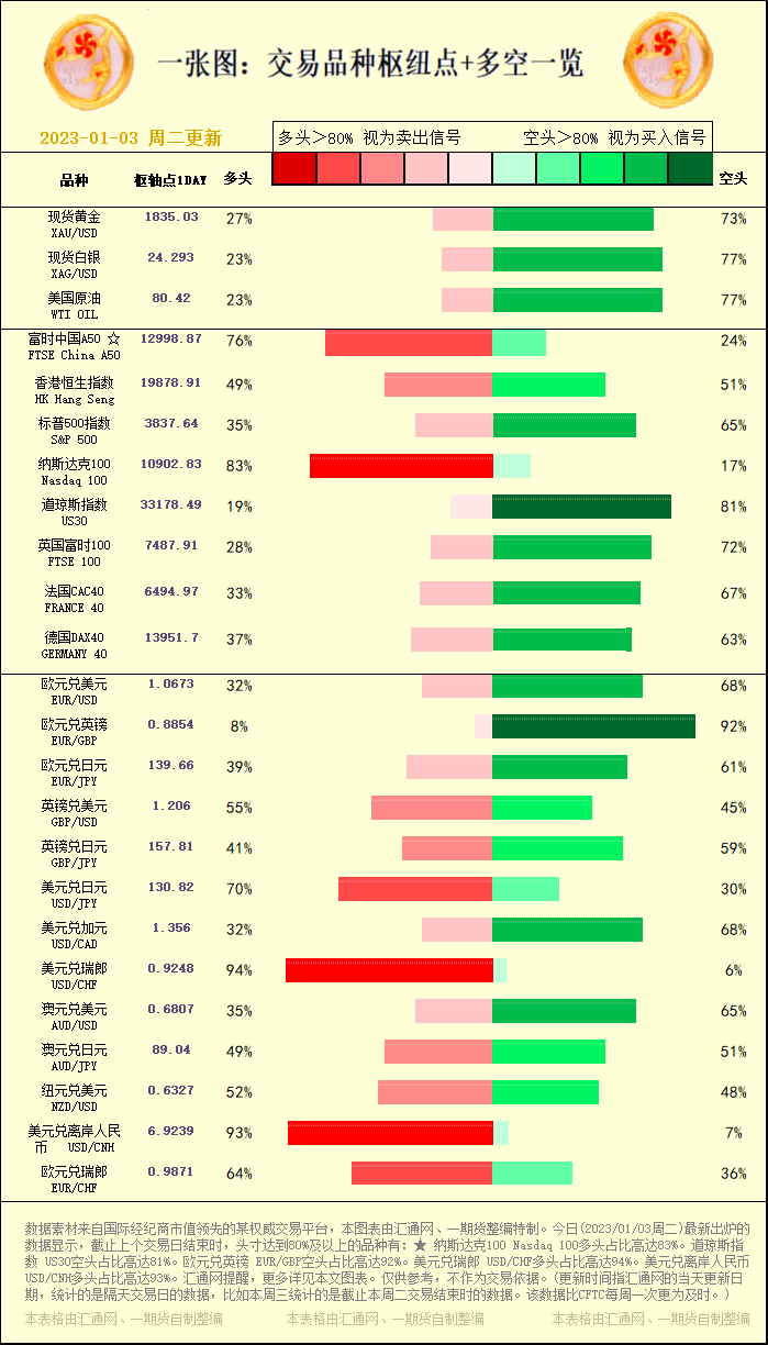汇通财经APP讯——一张图:交易品种枢纽点+多空占比一览。今日(2023/01/03周二)最新出炉的数据显示,截止上个交易日结束时,头寸达到80%及以上的品种有:★ 纳斯达克100 Nasdaq 10...