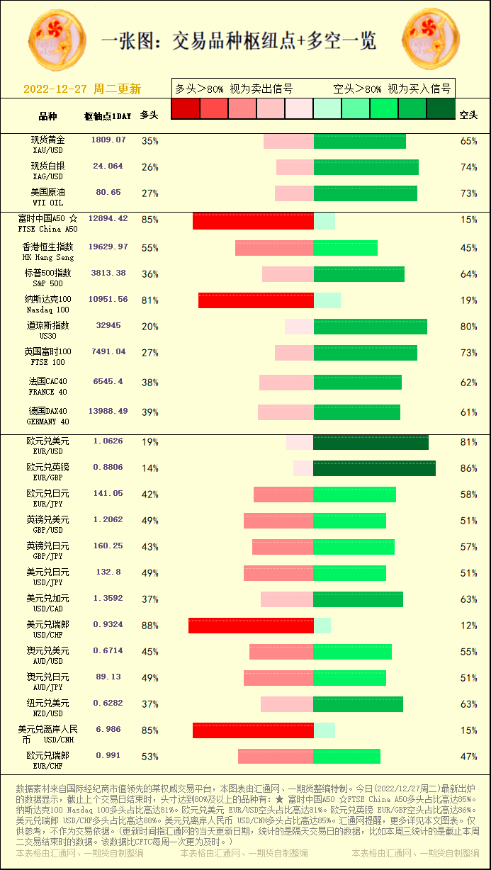 汇通财经APP讯——一张图:交易品种枢纽点+多空占比一览。今日(2022/12/27周二)最新出炉的数据显示,截止上个交易日结束时,头寸达到80%及以上的品种有:★ 富时中国A50 ☆FTSE Chi...
