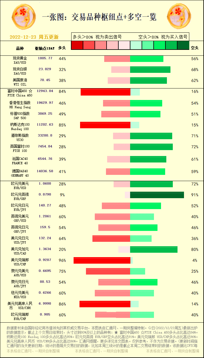 汇通财经APP讯——一张图:交易品种枢纽点+多空占比一览。今日(2022/12/23周五)最新出炉的数据显示,截止上个交易日结束时,头寸达到80%及以上的品种有:★ 富时中国A50 ☆FTSE Chi...