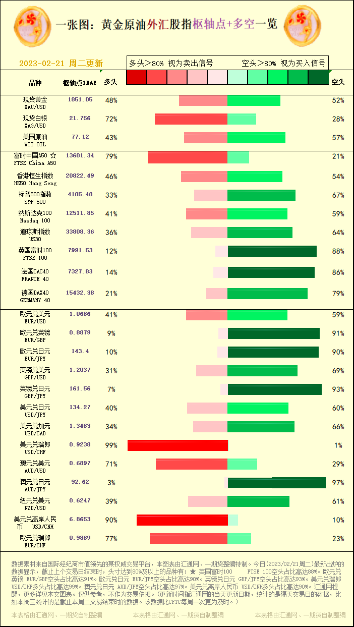 汇通财经APP讯——一张图:黄金原油外汇股指"枢纽点+多空占比"一览。今日(2023/02/21周二)最新出炉的数据显示,截止上个交易日结束时,头寸达到80%及以上的品种有:★ 英国富时100 FTS...