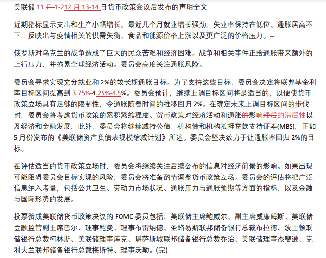 汇通财经APP讯——周三(12月15日)纽约时段盘中,北京时间12月15日周四凌晨3点,美联储公布最新的12月利率决议,美联储如期加息50基点,至4.25-4.50%。经济预期中,美联储上调通胀预期和...