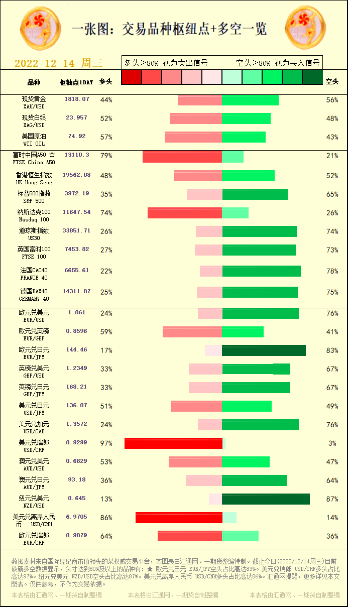 汇通财经APP讯——一张图:交易品种枢纽点+多空占比一览。截止今日(2022/12/14周三)目前最新多空数据显示,头寸达到80%及以上的品种有:★ 欧元兑日元 EUR/JPY空头占比高达83%。美元...