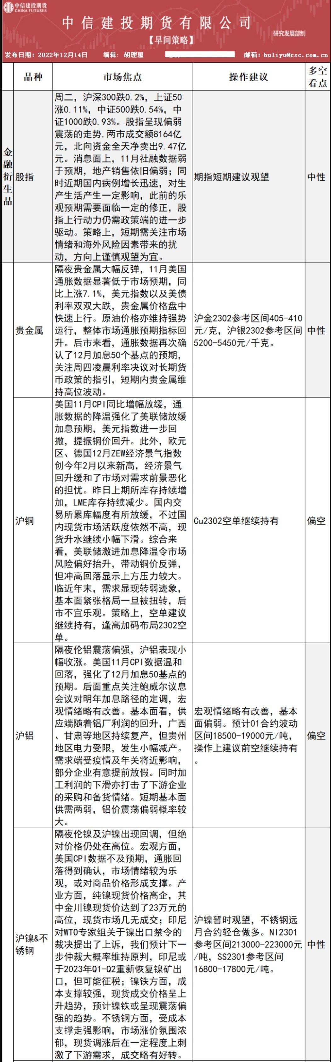 汇通财经APP讯——原油:原油价格亦维持强势运行,整体市场通胀预期指标回升。短期基本面供需两弱,铝价震荡偏弱概率较大。贵金属:通胀数据再次确认了12 月加息50个基点的预期,关注周四凌晨利率决议对长期...