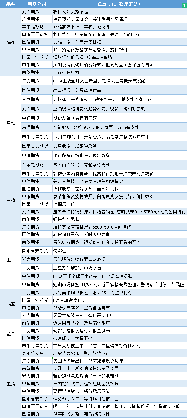 汇通财经APP讯——期货公司观点汇总一张图:12月14日农产品(棉花、豆粕、白糖、玉米、鸡蛋、生猪等)