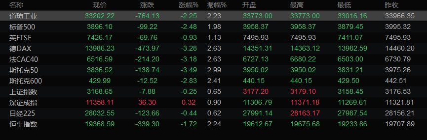 美股收盘情况:道琼斯工业指数下跌2.25%,至33202.22点;