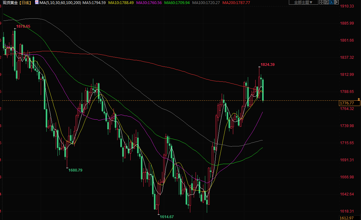 金价周四一度下跌多达2%,触及约一周以来最低,在美联储表示明年将进一步加息后,美元攀升。现货金下跌1.6%,至每盎司1777.88美元,稍早一度低见1771.89美元。